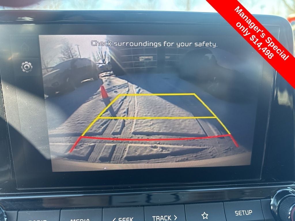 Equipped with 4 Speakers, 4-Wheel Disc Brakes, ABS brakes, Air Conditioning, AM/FM radio, Apple CarPlay & Android Auto, Auto High-beam Headlights, Brake assist, Bumpers: body-color, Cloth Seat Trim, Delay-off headlights, Driver door bin, Driver vanity mirror, Dual front impact airbags, Dual front side impact airbags, Electronic Stability Control, Exterior Parking Camera Rear, Front anti-roll bar, Front Bucket Seats, Front Center Armrest, Front reading lights, Front wheel independent suspension, Fully automatic headlights, Illuminated entry, Low tire pressure warning, Occupant sensing airbag, Outside temperature display, Overhead airbag, Overhead console, Panic alarm, Passenger door bin, Passenger vanity mirror, Power door mirrors, Power steering, Power windows, Radio data system, Radio: HD Display Audio System, Rear window defroster, Remote keyless entry, Security system, Speed control, Steering wheel mounted audio controls, Tachometer, Telescoping steering wheel, Tilt steering wheel, Traction control, Trip computer, Variably intermittent wipers, and Wheels: 15 Steel w/Wheel Covers.