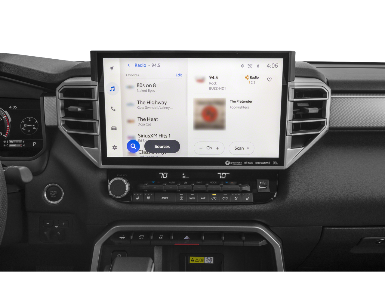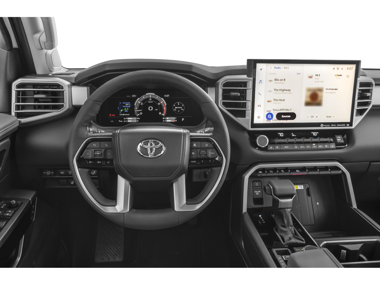 120V Deck & Cabin Power Supply, 20 Alloy Wheels, 3.31 Axle Ratio, 4-Wheel Disc Brakes, 8-Way Pwr Adjustable Heated/Ventilated Front Seats, 9 Speakers, ABS brakes, Air Conditioning, All Weather Floor Liners (TMS), Alloy wheels, AM/FM radio: SiriusXM, Apple CarPlay/Android Auto, Auto High-beam Headlights, Auto-dimming door mirrors, Auto-dimming Rear-View mirror, Automatic temperature control, Bed Step (TMS), Black Dual-Step Running Board (TMS), Blind Spot Monitor, Brake assist, Bumpers: body-color, Delay-off headlights, Driver door bin, Driver vanity mirror, Dual front impact airbags, Dual front side impact airbags, Electronic Stability Control, Emergency communication system: Safety Connect (10-year trial), Exhaust Tip - Black Chrome (TMS), Exterior Parking Camera Rear, Folding Color-Keyed Outside Mirrors, Front anti-roll bar, Front Bucket Seats, Front Center Armrest, Front dual zone A/C, Front fog lights, Front reading lights, Front wheel independent suspension, Fully automatic headlights, Garage door transmitter: HomeLink, Heated door mirrors, Heated front seats, Heated Leather Steering Wheel, High Grade Full LED Headlamp, Illuminated entry, JBL Premium Audio, Knee airbag, Leather Shift Knob, Low tire pressure warning, Memory seat, Multi-Terrain Back Monitor, Navigation System, Occupant sensing airbag, Outside temperature display, Overhead airbag, Overhead console, Panic alarm, Panoramic View Back Monitor, Panoramic View Monitor Package, Passenger door bin, Passenger vanity mirror, Power door mirrors, Power driver seat, Power Package, Power passenger seat, Power steering, Power Tilt/Slide Panoramic Sunroof, Power windows, Premium Package, Radio data system, Radio: Audio Multimedia System, Rear reading lights, Rear seat center armrest, Rear step bumper, Rear window defroster, Remote keyless entry, Safety Connect, Security system, SofTex Seat Trim, Speed control, Speed-sensing steering, Split folding rear seat, Stainless Steel Door Edge Guards (TMS), Steering wheel mounted audio controls, Tachometer, Telescoping steering wheel, Tilt steering wheel, Towing Package, Traction control, Trip computer, Turn signal indicator mirrors, Variably intermittent wipers, Ventilated front seats, Voltmeter, Wheel Locks (TMS), Wireless Charger. 2024 Toyota Tundra