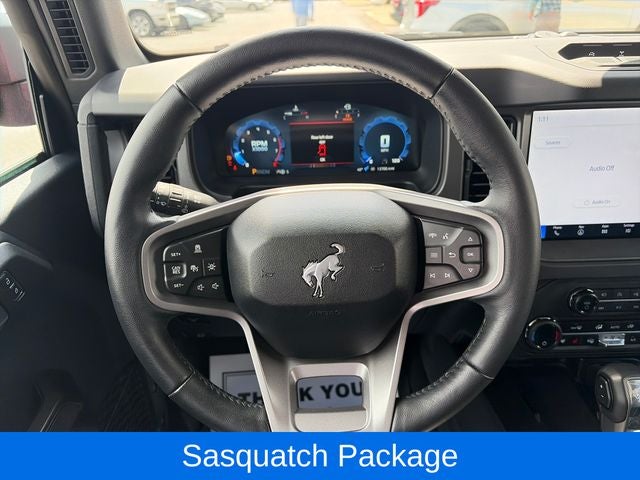 The exterior of this Bronco is finished in a bold and eye-catching Red, complemented by the Black Appearance Package that adds a touch of menacing style with its black grille, door handles, fender flares, and side mirror caps. The Sasquatch Package further enhances the Bronco's off-road prowess with high-clearance fender flares, high-clearance suspension, and position-sensitive Bilstein shock absorbers.