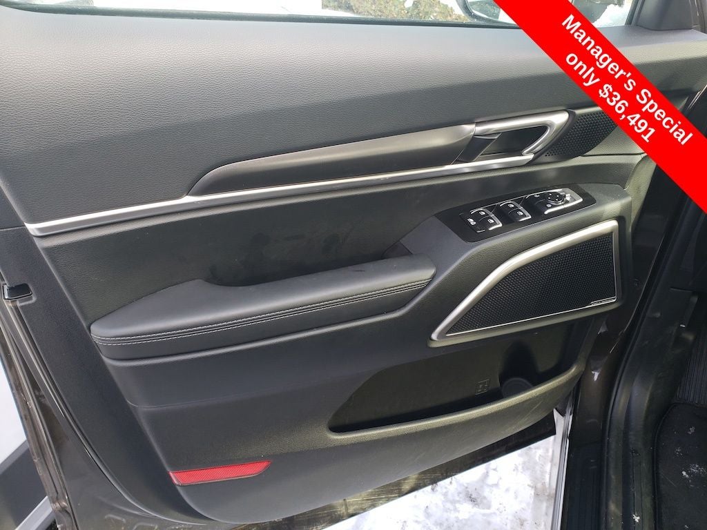 Equipped with Kia Certified Pre-Owned Certified, 3rd row seats: split-bench, 4-Wheel Disc Brakes, 6 Speakers, ABS brakes, Air Conditioning, Alloy wheels, AM/FM radio: SiriusXM, Apple CarPlay & Android Auto, Auto High-beam Headlights, Automatic temperature control, Brake assist, Bumpers: body-color, Carpeted Floor Mats, Delay-off headlights, Driver door bin, Driver vanity mirror, Dual front impact airbags, Dual front side impact airbags, Electronic Stability Control, Emergency communication system: 911 Connect, Exterior Parking Camera Rear, Four wheel independent suspension, Front anti-roll bar, Front Bucket Seats, Front Center Armrest, Front dual zone A/C, Front reading lights, Fully automatic headlights, Heated door mirrors, Heated Front Bucket Seats, Heated front seats, Illuminated entry, Knee airbag, Leather Shift Knob, Leather steering wheel, Low tire pressure warning, Mud Guard Kit, Navigation System, Occupant sensing airbag, Outside temperature display, Overhead airbag, Overhead console, Panic alarm, Passenger door bin, Passenger vanity mirror, Power door mirrors, Power driver seat, Power Liftgate, Power moonroof, Power steering, Power windows, Radio data system, Radio: AM/FM Display Audio System, Rear air conditioning, Rear anti-roll bar, Rear audio controls, Rear reading lights, Rear side impact airbag, Rear window defroster, Rear window wiper, Reclining 3rd row seat, Remote keyless entry, Security system, Speed control, Speed-sensing steering, Split folding rear seat, Spoiler, Steering wheel mounted audio controls, SynTex Synthetic Leather Seat Trim, Tachometer, Telescoping steering wheel, Tilt steering wheel, Traction control, Trip computer, Turn signal indicator mirrors, Variably intermittent wipers, and Wheels: 20 x 7.5 Black Finish.